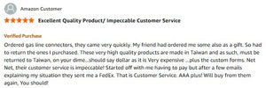 Ordered gas line connectors, they came very quickly. My friend had ordered me some also as a gift. So had to return the ones I purchased. These very high quality products are made in Taiwan and as such, must be returned to Taiwan, on your dime...should say dollar as it is Very expensive ...plus the custom forms. Net Net, their customer service is impeccable! Started off with me having to pay but after a few emails explaining my situation they sent me a FedEx. That is Customer Service. AAA plus! Will buy from them again, You should!